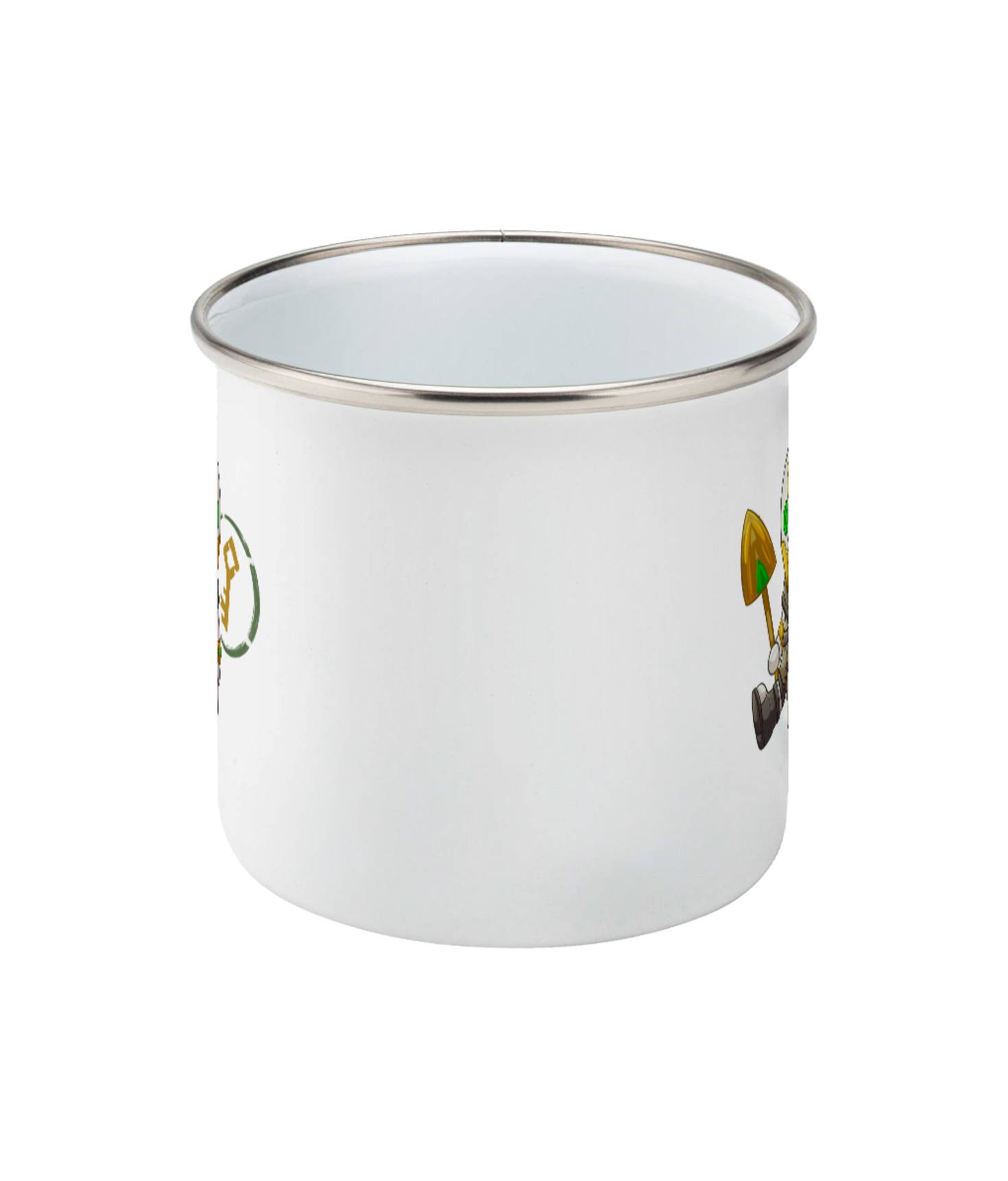 - 11oz white enamel mug with a bold Gold Hoarder design