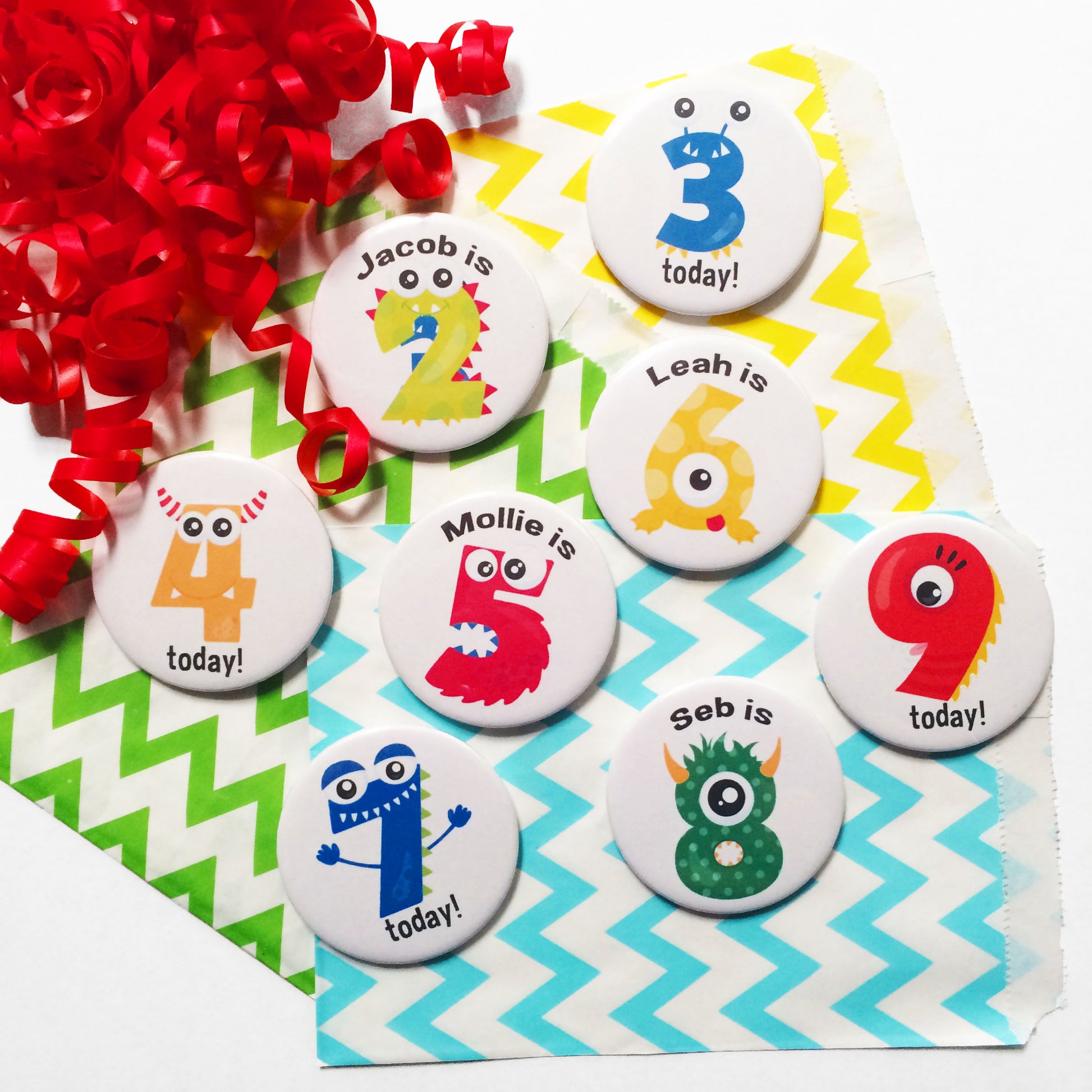 Each monster badge is 58mm (approx 2 1/4") and comes with a colourfully fun monster on the front along with "YOUR CHILD'S NAME is" above each number.