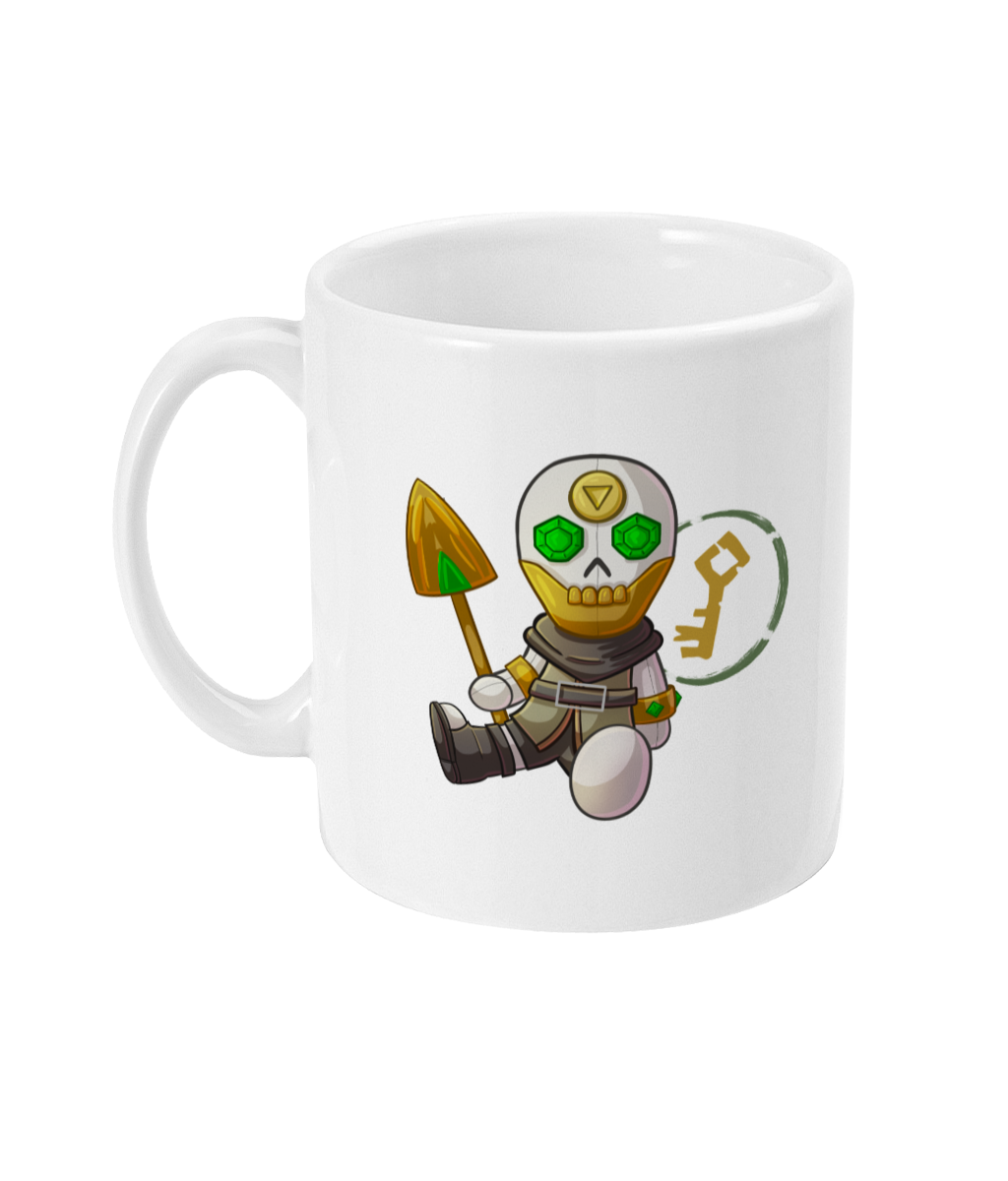 Designed to capture the spirit of the notorious Gold Hoarder himself, this mug features a fierce figure clutching his trusty shovel and the iconic Emissary logo by his side. The bold, eye-catching design wraps around this classic white mug, making it a must-have for any Sea of Thieves fan.
